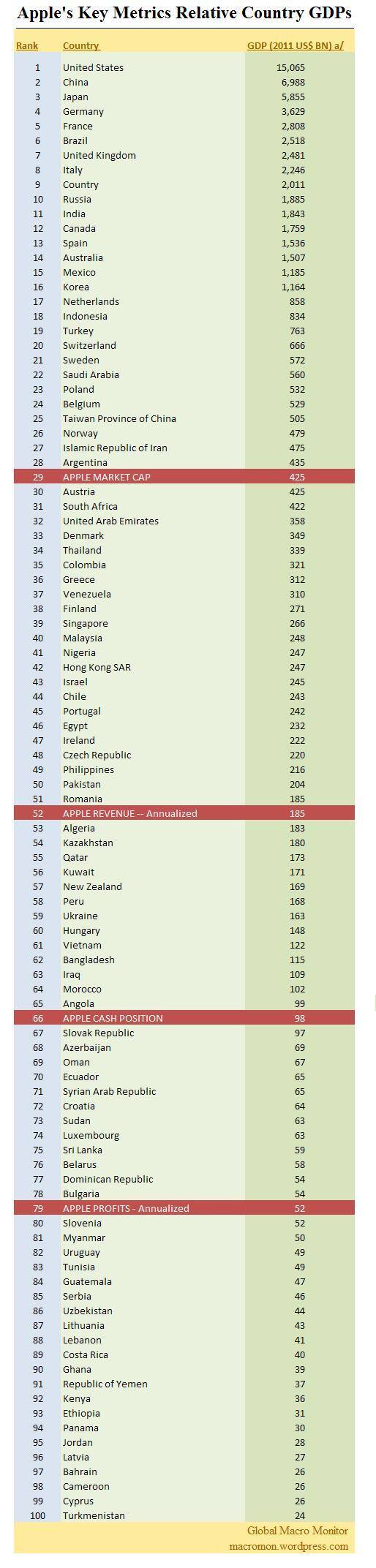 Apple's success is staggering. The company generated $16 billion in free cash flow this quarter, bringing their cash hoard close to a mind boggling $100 billion dollars.  What the company decides to do with this huge cash balance may be key to future gains in the shares, which at current prices places the value of the company at $420 billion and making it the most highly valued company in the nation. Computer Associates (CA), another lesser known technology company, announced that they would increase their dividend five fold yesterday - to an effective yield of 4.5% - contributing to a 10% gain by the shares today.    This response might provide fresh insight into how the market would respond to other cash rich technology companies that have rarely if ever paid a dividend, but with little or no debt, could easily afford to do so.   Rather than signalling the end of growth, deciding to pay a dividend could signal a vote of confidence in the sustainability of that growth while simultaneously meeting a rising demographic based need for income in a bond market bereft of yield and possessing a poor risk reward profile.  (Many decades ago, it was common for stocks to pay higher yields than bonds. ) The biggest restraint on further appreciation in Apple's shares may very well be the fact that it is already the nation's most highly valued company.  Though Apple's just announced 73% year over year gain in revenues and 52% year over year gain in earnings mocks at the notion that the company is running up against the law of large numbers, the fact that the stock is only up 6% today in spite of such results suggests a different story may be at work.   Any other company growing at such a rate - particularly any tech company - would be trading at 30x forward earnings rather than the 15x trailing earnings afforded the shares today.   If Apple's shares were to a little more than double once again (they've tripled in the last 30 months), it would be among the first - if not the first company - to approach a trillion dollar market cap.  Key to breaking upside resistance might be the prospect of sharing some cold hard cash with a market that is increasingly starved for yield. Crazy good.  So crazy good that Apple would rank among the world's largest country's if it were viewed as such and also, we might add, rank among its most solvent.  (See below.) (Incidentally, if you missed the New York Times article on Apple and China earlier this week, it's worth a read.   Given how many pension systems and 401k plans own the shares, I think Steve Jobs and company have done plenty for this great nation of ours.) Disclosures:  Please note that Broadleaf Partners, LLC currently owns shares in Apple Computer for its clients and reserves the right to change its opinion or position on such shares at anytime and without subsequent notice or disclosure.  This blog post is not to be taken as a recommendation of Apple shares.