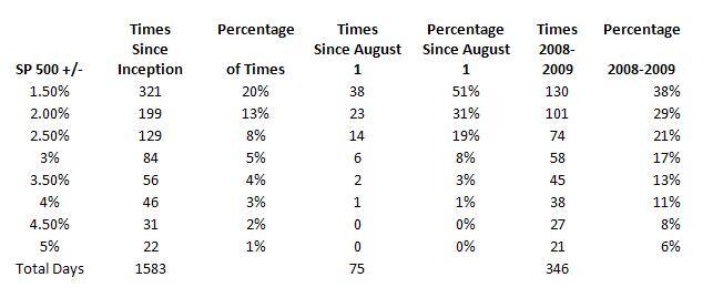 The daily moves in the market have been amazing in recent weeks. I was curious to know how amazing, so I took a look at the daily performance of the S&P 500 since the Broadleaf Growth Equity Portfolio started six years ago. Since our portfolio's inception - 1,583 trading days ago - the S&P 500 has had moves of 1.5% or more - up or down - twenty percent of the time. However, over the last 75 trading days, the instances of 1.5% or more moves have more than doubled to 51% of the time. Keeping in mind the fact that the longer term period includes the horrific days of the Great Recession in 2008-2009, this increase in volatility is even more remarkable. For those who were wondering, during the Great Recession - a period from September 2008 to December 2009 - the S&P 500 made 1.5% or greater moves roughly 38% of all trading days, which is still less than what we've experienced recently. The major moves of 2.5% or more, however, were more common. I don’t know what this means other than to say we are indeed in unusual territory with all the daily volatility, particularly considering the fact that earnings are quite good and leading indicators of the economy have been improving. While the risks from Europe and Washington are great, no catastrophes have yet been realized, as was the case with Lehman Brothers and Bear Stearns in 2008. The ride in equities appears to be getting even bumpier than normal, but the asset class, I believe, will be the best performing over the long haul.