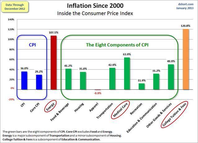 Provided below is a chart we found extremely interesting. It is a breakdown of inflation since 2000 in terms of the eight main components used to calculate the Consumer Price Index every month. Some of the growth in energy can obviously be attributed to growth in the emerging markets of the world over the last 12 years, but the growth in medical care and college tuition are purely domestic. Thoughts?