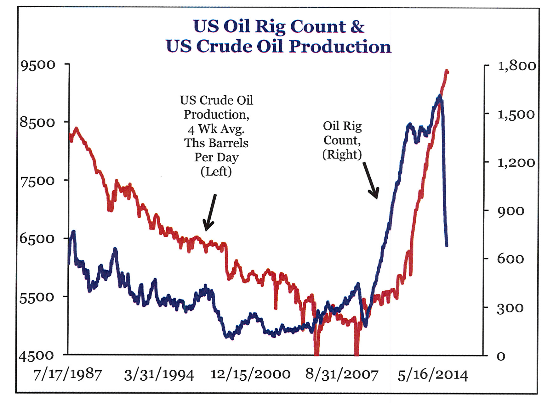 To this point, the graph below, courtesy of Strategas Research Partners, caught our eye this morning. While rig counts have declined rapidly from their highs (blue line), they also hit levels far above anything ever seen in the United States in the past thirty years! If rig counts were in a bubble, shouldn’t we expect oil supplies to remain elevated as well for quite some time? Even at the current level of rigs in the market, production levels should remain elevated if 1987 production is any indication. Given the advances in well productivity brought about in the past few years, it is no wonder that most companies see increasing production in the coming year in spite of the massive cuts to capital spending to date.